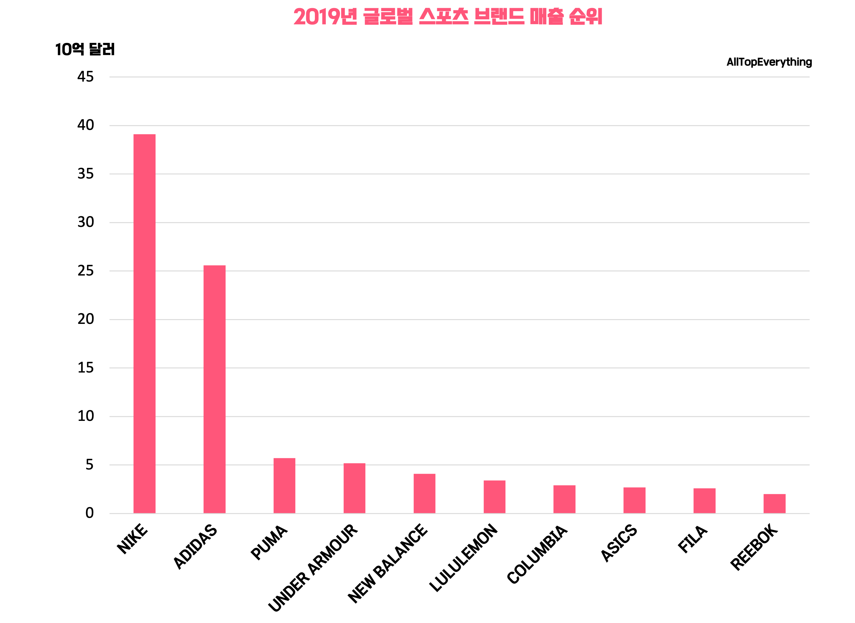 1위인 나이키는 390억 달러의 매출을 올린 반면 10위인 리복은 20억 달러에 그쳤다. 현재 리서치 기관들에서 예측하는 2020-2030년 사이의 글로벌 스포츠웨어 (의류 및 신발)의 연평균 성장률은 5-7% 수준임에 비해 실제 TOP 10 브랜드들 중 나이키, 아디다스, 푸마를 제외하고 성장률이 거의 정체한 상황이다. 상위 브랜드 중에도 아디다스와 푸마는 2010년 들어 역신장을 기록한적도 있어 매년 꾸준히 좋은 성장률을 보이는 나이키와의 격차는 더욱 커질 전망이다.